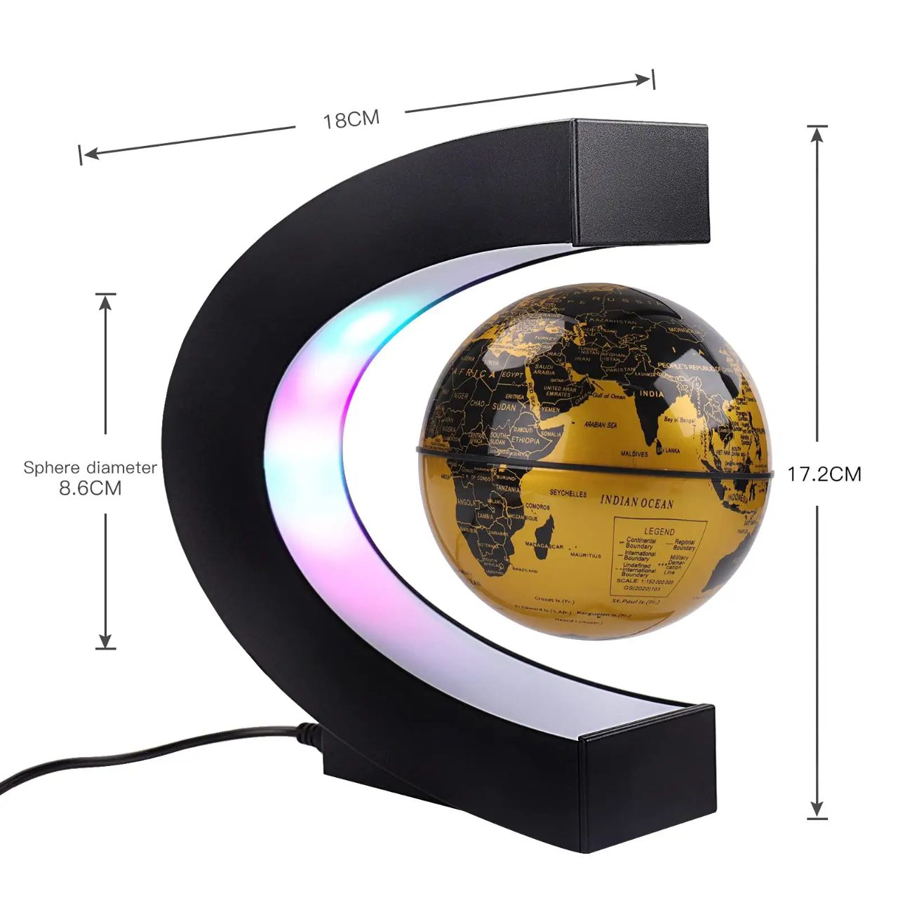 این وسیله منحصر به فرد دارای یک پایه C شکل با تابش زیبای نورهای LED میباشد که پس از تنظیم کره در نقطه چرخش، کره بوسیله نیروی مغناطیسی ایجاد شده به صورت معلق میچرخد و نمای بسیار زیبا و فوق العاده ای را به نمایش میگذارد