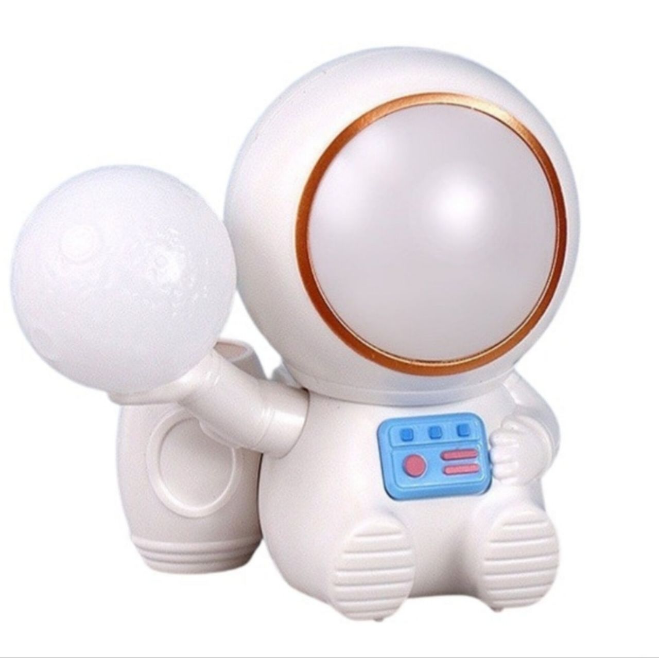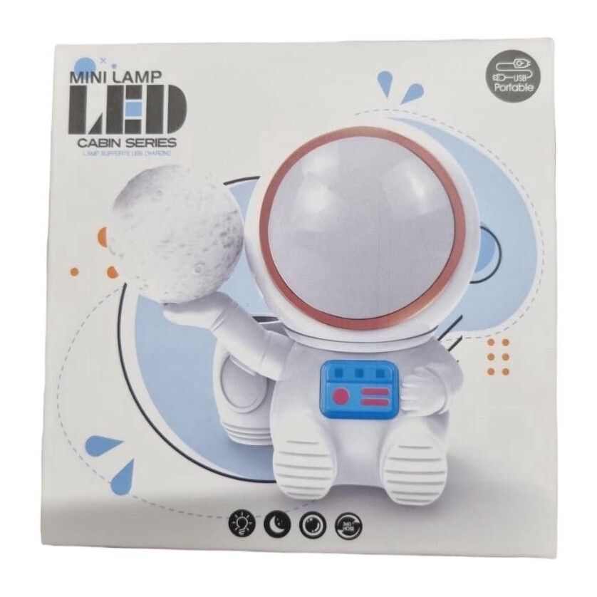 طراحی این چراغ خواب به شکل یک فضانورد کوچک که کره ماه را در دستان خود دارد است که با جزئیات دقیق و جذاب، حس ماجراجویی و سفر به فضا را القا میکند.