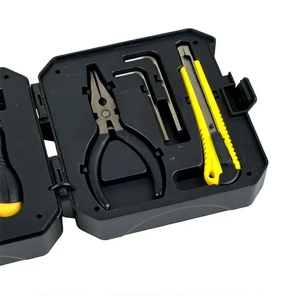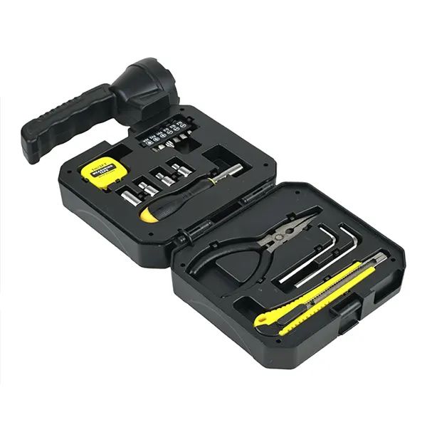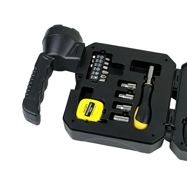 مجموعه ابزار مدل چراغ قوه دار دارای چراغ شارژی با ۶ حالت نوردهی است که مناسب روشنایی عمومی حالت نور اضطراری و نور نقطه ای می باشد. این محصول دارای ۱۶ قطعه ابزار کاربردی میباشد که شامل دم باریک متر آچار آلن دسته و سری پیچ گوشتی سری آچار بکس کاتر و.... است